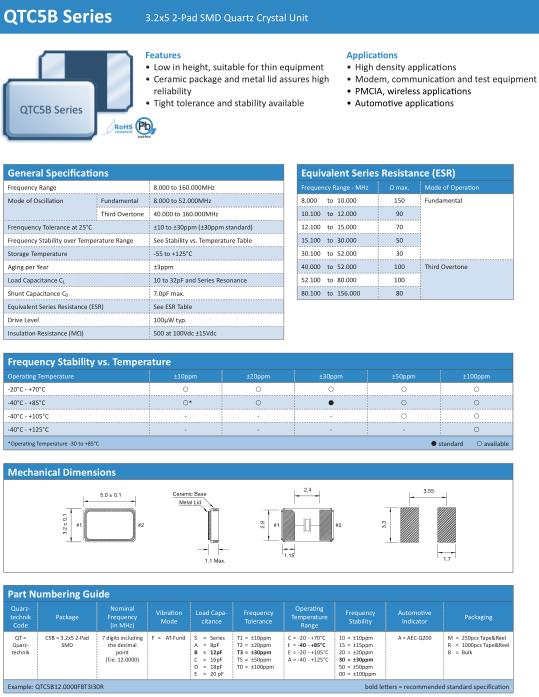 Quarztechnik晶振,QTC5B晶振,QTC5B16.0000FBT3I30R晶振,小型表面貼片晶振型,是標準的石英晶體振蕩器,適用于寬溫范圍的電子數碼產品,家電電器及MP3,MP4,播放器,單片機等領域.可對應8.000MHz以上的頻率,在電子數碼產品,以及家電相關電器領域里面發揮優良的電氣特性,滿足無鉛焊接的回流溫度曲線要求.