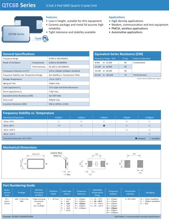 Quarztechnik晶振,QTC6B晶振,QTC6B20.0000FBT3I30R晶振,貼片晶振本身體積小,超薄型石英晶體振蕩器,特別適用于有目前高速發展的高端電子數碼產品,因為晶振本身小型化需求的市場領域,小型,薄型是對應陶瓷振蕩器(偏差大)和普通的石英晶體振蕩器(偏差小)的中間領域的一種性價比較出色的產品.產品廣泛用于筆記本電腦,無線電話,衛星導航SSD,USB,Blu-ray等用途,符合無鉛焊接的高溫回流焊曲線特性.