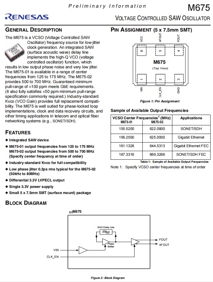 | M675-02-AHT | Renesas晶振 | XTAL OSC VCSO 669.3266MHZ LVPECL | M675 |