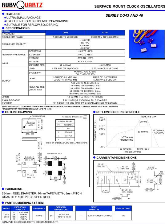 Rubyquartz晶振,CO43晶振,CO4305-26.000-TR晶振,小型SMD有源晶振,從最初超大體積到現(xiàn)在的7050mm,6035mm,5032mm,3225mm,2520mm體積,有著翻天覆地的改變,體積的變小也使產(chǎn)品帶來了更高的穩(wěn)定性能,接縫密封石英晶體振蕩器,精度高,覆蓋頻率范圍寬的特點(diǎn),SMD高速自動(dòng)安裝和高溫回流焊設(shè)計(jì),Optionable待機(jī)輸出三態(tài)輸出功能,電源電壓范圍:1.8V~5V,高穩(wěn)定性,低抖動(dòng),低功耗,主要應(yīng)用領(lǐng)域:無線通訊,高端智能手機(jī),平板筆記本W(wǎng)LAN,藍(lán)牙,數(shù)碼相機(jī),DSL和其他IT產(chǎn)品的晶振應(yīng)用,三態(tài)功能,PC和LCDM等高端數(shù)碼領(lǐng)域,符合RoHS/無鉛.
