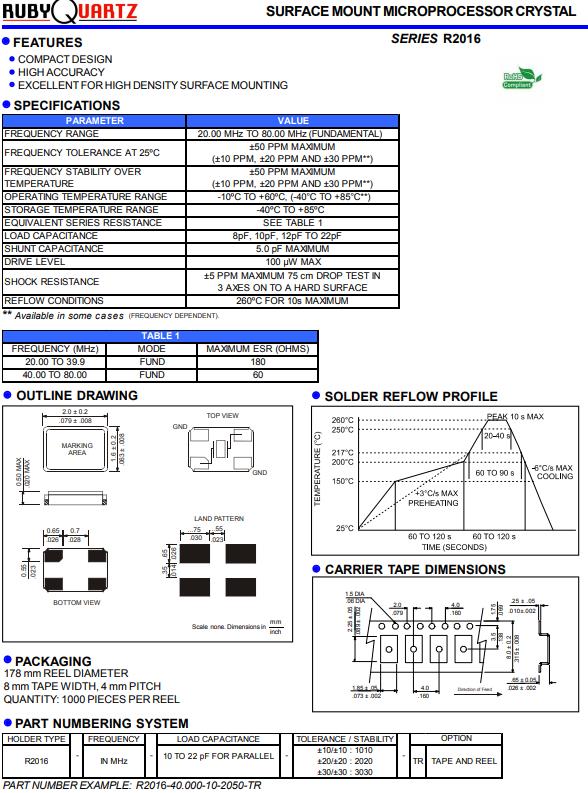 Rubyquartz晶振,R2016晶振,R2016-20.000-10-2050-TR晶振,貼片晶振本身體積小,超薄型石英晶體振蕩器,特別適用于有目前高速發展的高端電子數碼產品,因為晶振本身小型化需求的市場領域,小型,薄型是對應陶瓷振蕩器(偏差大)和普通的石英晶體振蕩器(偏差小)的中間領域的一種性價比較出色的產品.產品廣泛用于筆記本電腦,無線電話,衛星導航SSD,USB,Blu-ray等用途,符合無鉛焊接的高溫回流焊曲線特性.