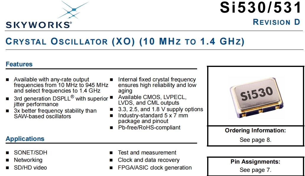 SkyworksLVDS晶振,Si531游戲設備晶振,531FC300M000DG