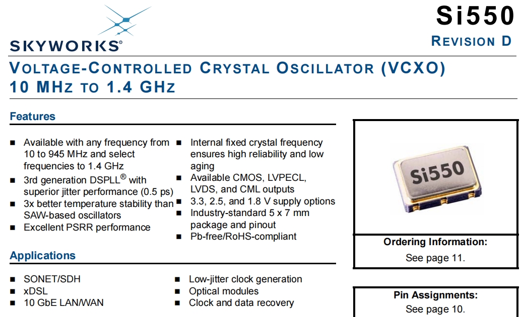 | 550MD1150M00DGR | Skyworks有源晶振 | XTAL OSC VCXO 1150.0000MHZ LVPEC | Si550 | 1150 MHz | LVPECL |
