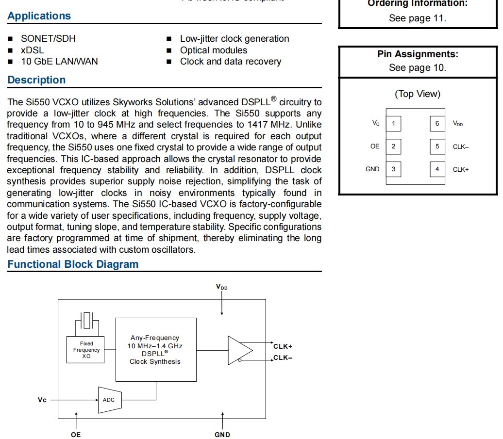 | 550AA1000M00DG | Skyworks有源晶振 | XTAL OSC VCXO 1.0000GHZ LVPECL | Si550 | 1 GHz | LVPECL |