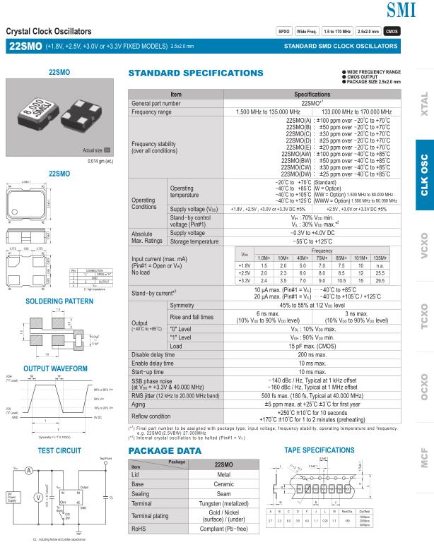 SMI晶振,22SMO晶振,SPXO振蕩器,有源晶振,是指晶體本身起振需要外部電壓供應,起振后可直接驅動CMOS集成電路,產品本身已實現與薄型IC(TSSOP封裝,TVSOP封裝)同樣的1mm厚度,斷開時的消費電流是15µA以下,編帶包裝方式可對應自動搭載及IR回流焊接(無鉛對應)產品有幾種電壓供選1.8V,2.5V,3V3.3V,5V,以應對不同IC產品需要.