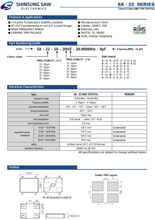 Shinsung晶振,SX-22晶振,SX-22-10-20HZ-20.000MHz-9pF晶振,小型貼片石英晶振,外觀尺寸具有薄型表面貼片型石英晶體振蕩器,特別適用于有小型化要求的市場領域,比如智能手機,無線藍牙,平板電腦等電子數(shù)碼產(chǎn)品.晶振本身超小型,薄型,重量輕,晶體具有優(yōu)良的耐環(huán)境特性,如耐熱性,耐沖擊性,在辦公自動化,家電相關電器領域及Bluetooth,WirelessLAN等短距離無線通信領域可發(fā)揮優(yōu)良的電氣特性,滿足無鉛焊接的回流溫度曲線要求.