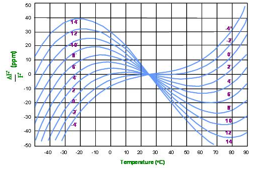 是以AT切割角度變動在厚度振動模態的頻率對溫度特性的展開圖. “1XXD38400HCA”,圖中以常用的室溫攝式25度作為相對零點, AT切割的最大優點是頻率對溫度變化為一元三次方曲線. 這個特性, 從(如圖)中可以看到, 在相當寬廣的溫度范圍下, AT切割的溫度曲線的第一階及第二階常數為零, 第三階的常數便決定了頻率對溫度的變化值.