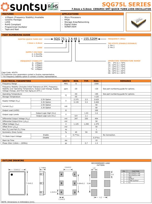 Suntsu晶振,SQG75L晶振,SQG75L3A481-12.000M晶振,小型SMD有源晶振,從最初超大體積到現在的7050mm,6035mm,5032mm,3225mm,2520mm體積,有著翻天覆地的改變,體積的變小也使產品帶來了更高的穩定性能,接縫密封石英晶體振蕩器,精度高,覆蓋頻率范圍寬的特點,SMD高速自動安裝和高溫回流焊設計,Optionable待機輸出三態輸出功能,電源電壓范圍:1.8V~5V,高穩定性,低抖動,低功耗,主要應用領域:無線通訊,高端智能手機,平板筆記本WLAN,藍牙,數碼相機,DSL和其他IT產品的晶振應用,三態功能,PC和LCDM等高端數碼領域,符合RoHS/無鉛.