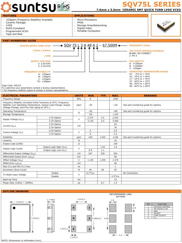 在接下來的三年中,我們的產品線迅速增長。我們從專注超小型晶體和TCXO溫補晶振開始,到提供各種低噪聲振蕩器和VCXO壓控晶振。2007年,我們進一步擴展了我們的產品線,包括大量高穩定性/低噪聲OCXO,以滿足基站和軍事通信設備應用等需要晶體的最高頻率穩定性的需求。Suntsu晶振,SQV75L晶振,SQV75L3A48A2-24.000M晶振.