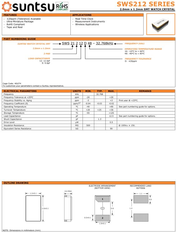 Suntsu晶振,SWS212晶振,SWS21212D48-32.768kHz晶振,32.768K時鐘晶體具有小型,薄型,輕型的貼片晶振表面音叉型晶體振蕩器,產品具有優良的耐熱性,耐環境特性,可發揮晶振優良的電氣特性,符合RoHS規定,滿足無鉛焊接的高溫回流溫度曲線要求,金屬外殼的封裝使得產品在封裝時能發揮比陶瓷振蕩器外殼更好的耐沖擊性.