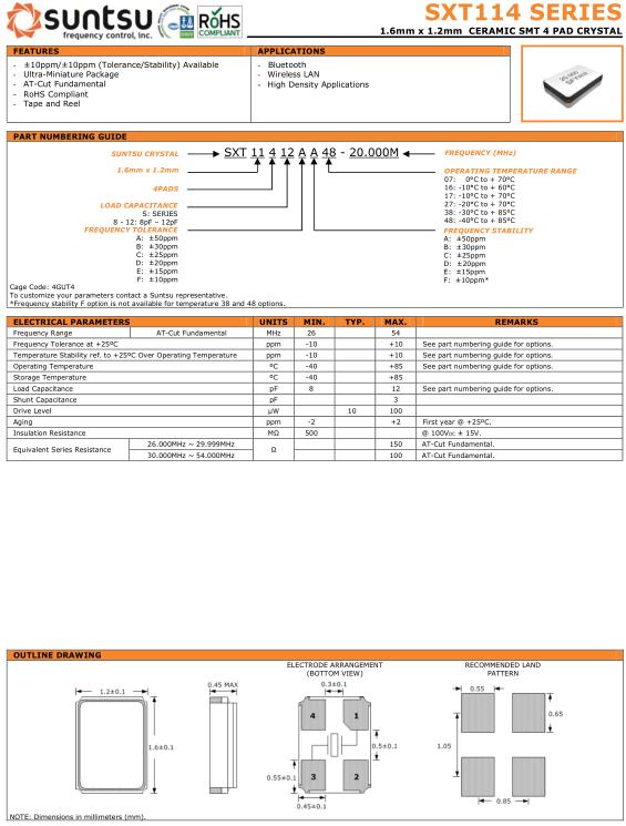 Suntsu晶振,SXT114晶振,SXT11412AA48-20.000M晶振,貼片晶振本身體積小,超薄型石英晶體振蕩器,特別適用于有目前高速發展的高端電子數碼產品,因為晶振本身小型化需求的市場領域,小型,薄型是對應陶瓷振蕩器(偏差大)和普通的石英晶體振蕩器(偏差小)的中間領域的一種性價比較出色的產品.產品廣泛用于筆記本電腦,無線電話,衛星導航SSD,USB,Blu-ray等用途,符合無鉛焊接的高溫回流焊曲線特性.