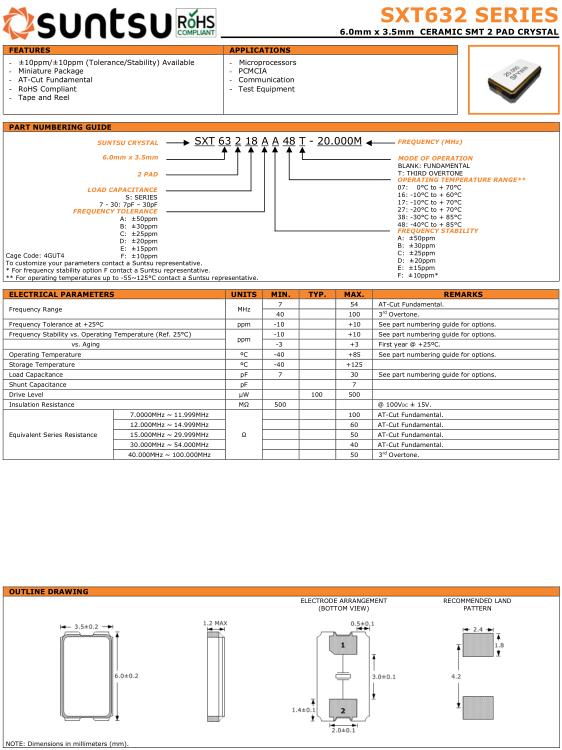Suntsu晶振,SXT632晶振,SXT63218AA48T-20.000M晶振,貼片晶振本身體積小,超薄型石英晶體振蕩器,特別適用于有目前高速發(fā)展的高端電子數(shù)碼產(chǎn)品,因為晶振本身小型化需求的市場領(lǐng)域,小型,薄型是對應陶瓷振蕩器(偏差大)和普通的石英晶體振蕩器(偏差小)的中間領(lǐng)域的一種性價比較出色的產(chǎn)品.產(chǎn)品廣泛用于筆記本電腦,無線電話,衛(wèi)星導航SSD,USB,Blu-ray等用途,符合無鉛焊接的高溫回流焊曲線特性.