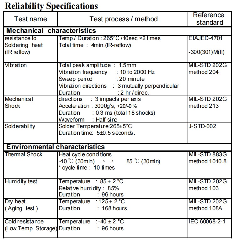 | Insulation Resistance | 500M W min at DC 100V +/-15V |