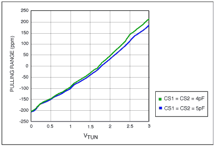 為了限制VCXO的調諧范圍,我們可以通過改變外部并聯電容來設置上限.并聯電容的值在4ps-7ps的范圍內,具體取決于電路板的寄生電容.另一方面,較低的范圍由內部矢量的值確定,其不能在外部改變.為了減少寄生電容對上調諧范圍的影響,在電路板布局中,我們應該盡量減小石英晶振引腳對地的寄生電容,從而在引腳與接地和電源方案之間提供良好的間隙.