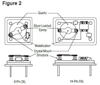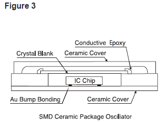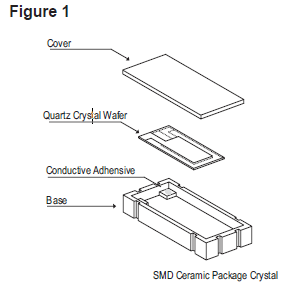 石英晶振單元包括一個石英小條或小圓盤,根據(jù)客戶指定的諧振頻率加工成精確的尺寸和厚度.石英鍍有導(dǎo)電電極,并安裝在密封的保護(hù)外殼中(見圖1). 電極通過玻璃-金屬密封連接到穿過基座組件的引線,或者在SMD陶瓷封裝的情況下(見圖1);電極通過層狀電鍍陶瓷連接到焊盤.