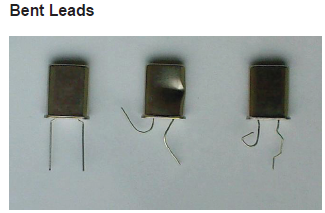 引線過度彎曲會損壞玻璃與金屬之間的密封,從而導(dǎo)致外殼失去氣密性.外殼充滿干燥的惰性氣體,失去氣密性將導(dǎo)致產(chǎn)品因大氣污染而迅速變質(zhì).因此,搬運(yùn)壓電石英晶體時應(yīng)小心,不要拉或彎曲引線.如果組件需要以彎曲的方式移動,引線應(yīng)該稍微彎曲遠(yuǎn)離玻璃密封件,以避免破裂.推薦的最小曲率半徑取決于產(chǎn)品,例如HC49晶體為2mm,UM1s晶體為1mm. 帶卷產(chǎn)品