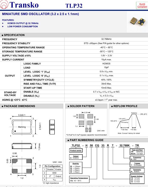 Transko晶振,TLP32晶振,TLP32-H50CQ33RT-32.768K-TR晶振,32.768K時(shí)鐘晶體具有小型,薄型,輕型的貼片晶振表面音叉型晶體振蕩器,產(chǎn)品具有優(yōu)良的耐熱性,耐環(huán)境特性,可發(fā)揮晶振優(yōu)良的電氣特性,符合RoHS規(guī)定,滿足無鉛焊接的高溫回流溫度曲線要求,金屬外殼的封裝使得產(chǎn)品在封裝時(shí)能發(fā)揮比陶瓷振蕩器外殼更好的耐沖擊性.