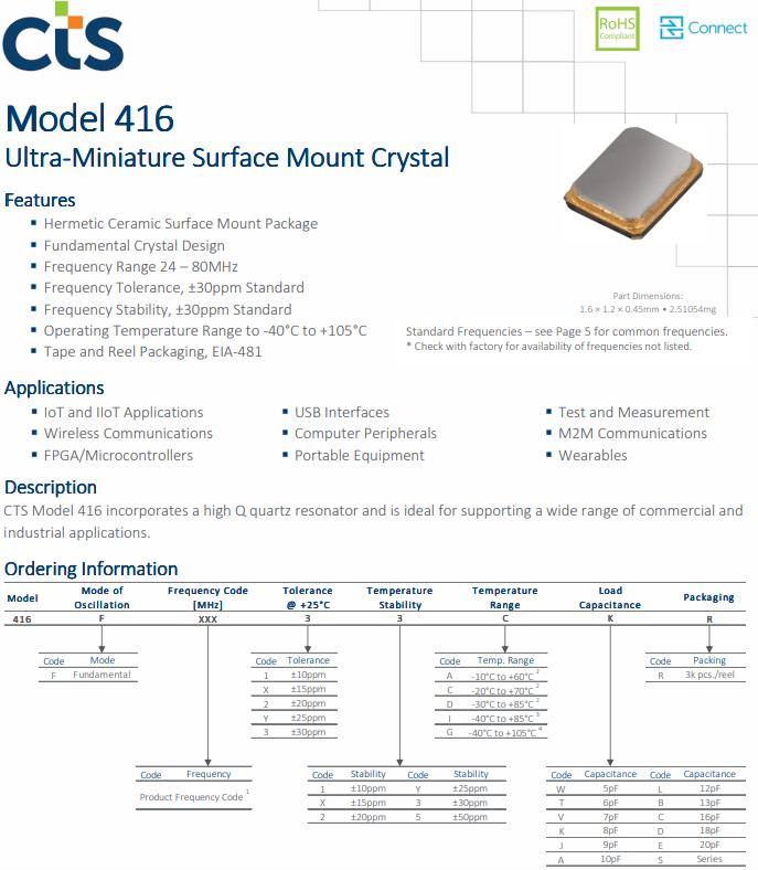 | 416F40613CTR | CTS晶振 | 416 | MHz Crystal | 40.61MHz |