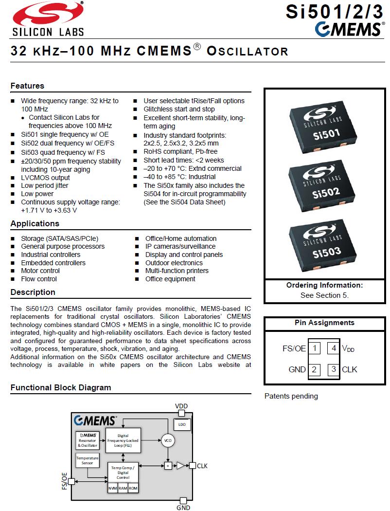 編碼501BCAM032768DAG,型號Si501,頻率為32.768KHZ,Si501/2/3CMEMS振蕩器系列提供基于mems的單片集成電路取代傳統晶體振蕩器。硅實驗室的CMEMS技術結合了標準的CMOS+MEMS在一個單一的,單片IC提供集成,高品質和高可靠性的SMD振蕩器。每個設備都經過工廠測試并配置為保證性能的數據表規范跨越電壓、工藝、溫度、沖擊、振動和老化。