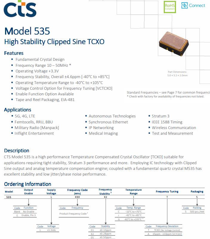 更多>>CTS發布高性能微型精密TCXO振蕩器535L160X21T5,適用于要求緊密穩定性的軍事無線電