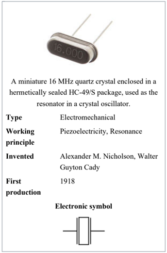 到1950年,貝爾實驗室開發了一種工業規模的熱液石英晶振生長工藝.到20世紀70年代,幾乎所有用于電子產品的晶體都是合成的. 1968年,于爾根•斯陶德在北美航空公司(現在的洛克威爾)工作時,發明了一種制造石英晶體振蕩器的光刻工藝,這種工藝使石英晶體振蕩器可以做得足夠小,可以用于手表等便攜式產品.盡管晶體振蕩器仍然最常用石英晶振,但使用其他材料的器件正變得越來越普遍,例如陶瓷諧振器.晶體是一種固體,其中組成原子,分子或離子以規則有序,重復的模式在所有三個空間維度上排列.幾乎任何由彈性材料制成的物體都可以像晶體一樣使用,帶有適當的傳感器,因為所有物體都有固有的振動共振頻率.例如,鋼非常有彈性,并且有很高的聲速.在石英出現之前,它通常用于機械過濾器.共振頻率取決于材料的大小,形狀,彈性和聲速.高頻晶體通常被切割成簡單的矩形板的形狀.低頻晶體,例如那些用于數字手表的,通常被切割成音叉的形狀.對于不需要非常精確定時的應用,通常使用低成本陶瓷諧振器來代替石英晶體.