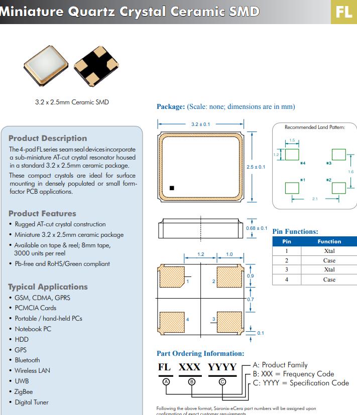 4墊FL系列石英晶體諧振器由接縫密封裝置一個微型at切割晶體諧振腔標準的3.2 x 2.5mm陶瓷包裝。這些致密的晶體是理想的表面安裝在人口密集或小尺寸PCB應用。