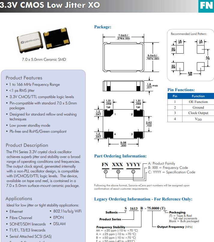 | FN6400017 | Diodes晶振 | SaRonix-eCera™ FN | 64MHz | ±50ppm | -20°C ~ 70°C |