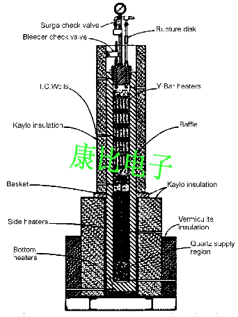 培養的石英在稱為高壓釜的大型壓力容器中生長(參見下面的示意圖).高壓釜是一個金屬圓筒,一端封閉,能承受高達30,000磅/平方英寸的壓力,內部溫度為700至800°F.它通常高12至20英尺,直徑2至3英尺 將純的但未面對的石英晶體諧振器中的石英(尺寸為1至1.5英寸)的小碎片(稱為“lascas或營養物”)放置在金屬絲網籃中并降低到容器的下半部分中.帶有預先安排的孔的鋼板,稱為“擋板”,設置在籃筐的頂部.擋板用于分離生長(種子)區域和營養區域,并幫助建立兩個區域之間的溫差.適當取向的單晶板(天然的或培養的),稱為"種子",安裝在架子上并懸掛在容器上半部的擋板頂部.然后將高壓釜用堿性水溶液(碳酸鈉或氫氧化鈉)填充至其自由體積的約80%,以允許將來的液體膨脹,并用高壓封閉物密封.然后通過連接到圓筒外圓周的一系列電阻加熱器使高壓釜達到工作溫度.隨著溫度升高,壓力開始在高壓釜內形成.溫度為700至800在容器的下半部分達到°F,而上半部分保持在比下半部分低70至80°F的溫度.