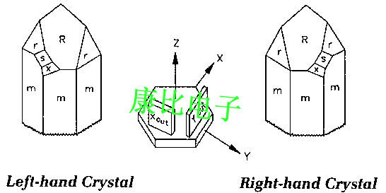 α-石英屬于晶體學類32,它是六角形棱柱,每端有六個帽面.棱鏡面指定為m面,蓋面指定為R面和r面.R面通常被稱為主要菱形面,r面是次要的菱形面.左手和右手晶振都是自然發生的,可以通過S面和X面的位置來區分. 如上面的示意圖所示,α-石英晶體具有三重對稱的單軸(三角軸),并且它具有與該三角軸垂直的三個雙重對稱軸(二軸).二維軸間隔120°并且是極軸,也就是說,可以為它們分配一定的感覺.極軸的存在意味著缺乏中心對稱性,并且是壓電效應存在的必要條件.二軸也稱為石英電軸(x軸,y軸).在具有完全發展的自然面的晶體中,每個極軸的兩端可以通過S面和X面的存在或不存在來區分.當在電軸方向上施加壓力時,在由這些面改變的軸的那一端產生負電荷.三角軸,也稱為光軸(z軸),不是極性的,因為與其垂直的二軸的存在意味著三角軸的兩端是等效的.因此,沿光軸不會產生壓電極化.在直角坐標系中,z軸平行于m個棱鏡面.以其垂直于x軸的主表面切割的石英板稱為X切割板.將切割繞z軸旋轉90度給出Y切割板,其y軸現在垂直于主表面.由于石英晶體具有六個棱鏡面,因此x軸和y軸存在三種選擇.選擇是任意的;每個行為都相同.