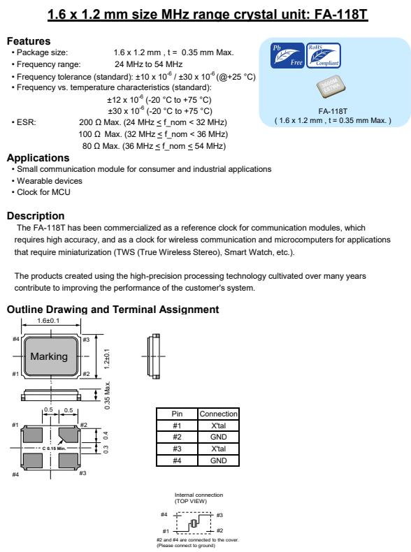 | X1E000251010400 | 1.6 x 1.2 x 0.35mm | FA-118T | 32.000000 MHz | 10 pF | +/-20 ppm |