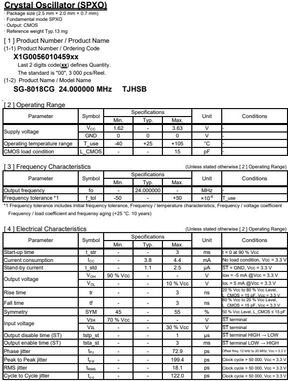 | X1G005601045900 | SG-8018CG | 24.000000 MHz | 2.50 x 2.00 x 0.80 mm | CMOS | 1.620 to 3.630 V | -40 to 105 °C | +/-50 ppm | ≤ 4.4 mA |