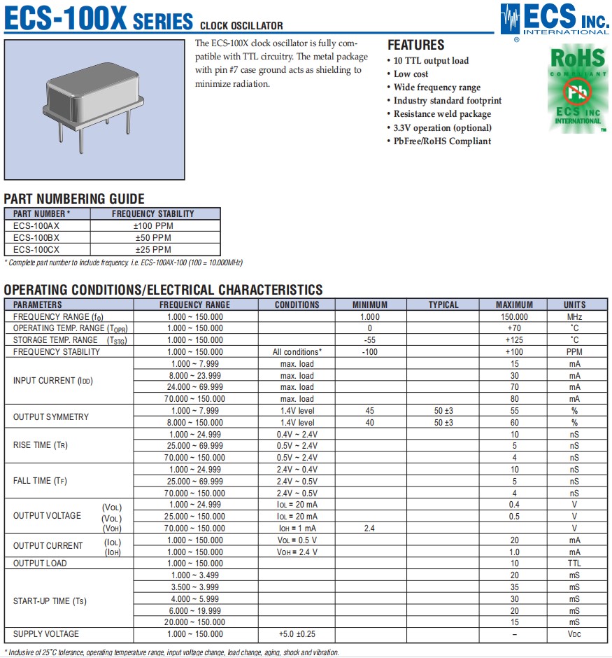 | ECS-100AX-500 | ECS晶振 | ECS-100X | 50MHz | 0°C ~ 70°C | 0.821" L x 0.520" W (20.86mm x 13.20mm) |