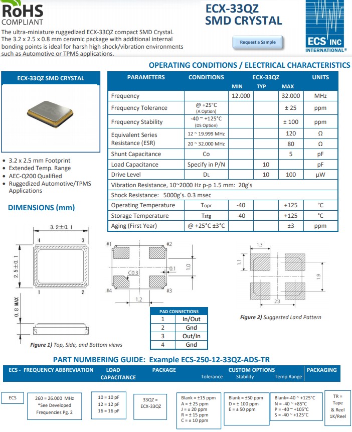 | ECS-320-18-33Q-DS | ECS Crystal | ECX-33Q | 32MHz | -40°C ~ 125°C |