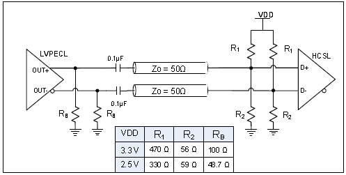 圖3:LVPECL至HCSL接口6利用LVPECL振蕩器驅動共模抑制接收機