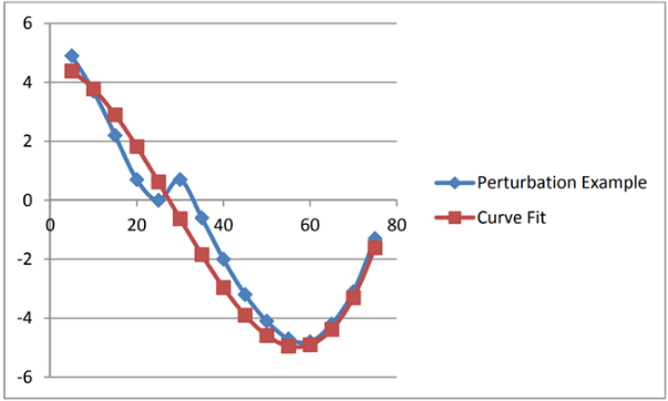 擾動 該圖中的測量數(shù)據(jù)標記為藍色.紅線是嘗試將三階多項式擬合到數(shù)據(jù).對于沒有擾動的晶體,多項式和測量數(shù)據(jù)之間的匹配應該優(yōu)于所有點的0.5ppm.三階多項式通常足以用于AT切割晶體.