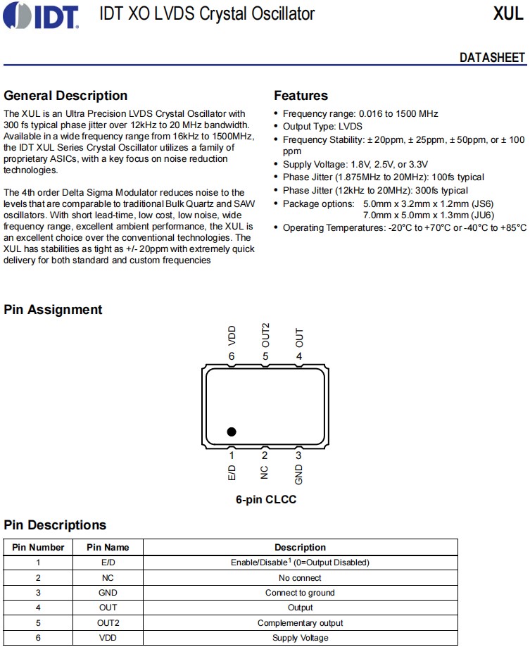 | XUL736100.000JU6I | IDT晶振 | OSC XO 100.0000MHZ LVDS SMD | XUL | 100MHz |