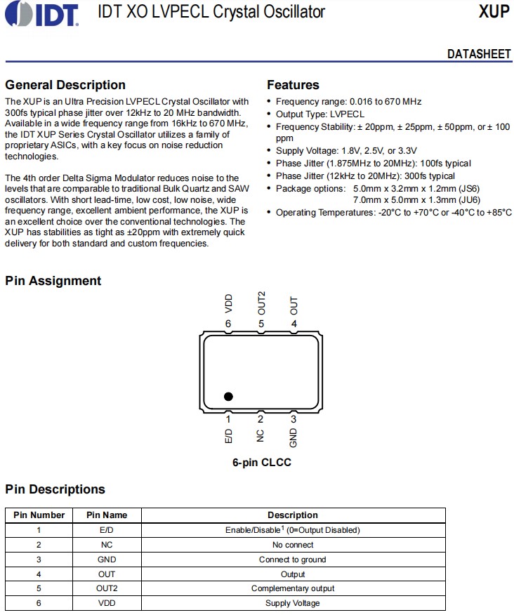 | XUP736100.000JU6I | IDT晶振 | OSC XO 100.0000MHZ LVPECL SMD | XUP | 100MHz | LVPECL |