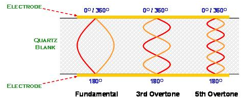 在AT切割角度的石英晶體共振子主要是以厚度剪切振蕩模態存在. 石英晶體在共振時, 除了基本波振蕩之外, 高階的倍頻共振也與基本波振蕩同時存在于石英晶體的電極區域之間. 但是, 由于壓電材料的電極是電氣相位相反的振動環境, 所以, 祇有奇數倍(odd number)的高頻倍頻可以發生, 偶數倍(even number)的倍頻共振在石英晶體共振子是不會存在的(如左圖).