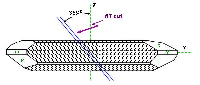 在各種不同種類(lèi)的切割角度方式中,“1XSE038400AR”, AT角度切割的石英芯片適用在數(shù)MHz到數(shù)佰MHz的頻率范圍,是石英芯片應(yīng)用范圍最廣范及使用數(shù)量最多的一種切割應(yīng)用方式. 在(圖五)中, 從石英晶棒X-軸向的上視圖, 可以看到對(duì)Z-軸向旋轉(zhuǎn)約35度的AT 方向. 這在大量生產(chǎn)的技術(shù)上也是很好達(dá)成的一種作業(yè)方式.