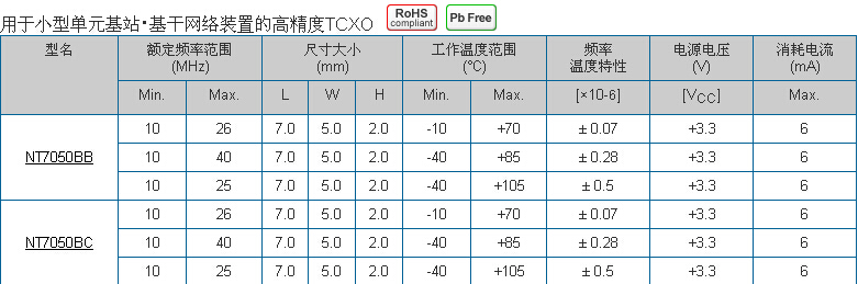 NT7050BC晶體,十腳貼片晶體,NDK溫補(bǔ)晶振產(chǎn)品本身具有溫度補(bǔ)償作用,高低溫度穩(wěn)定性:頻率精度高0.5 PPM?2.0 PPM,工作溫度范圍: - 30度85度,電源電壓:1.8V、3.3V之間可供選擇,產(chǎn)品本身具有溫度電壓控制功能,世界上最薄的晶振封裝,頻率:26兆赫,33.6兆赫,38.4兆赫,40兆赫,因產(chǎn)品性能穩(wěn)定,精度高等優(yōu)勢(shì),被廣泛應(yīng)用到一些比較高端的數(shù)碼通訊產(chǎn)品領(lǐng)域,GPS全球定位系統(tǒng),智能手機(jī),WiMAX和蜂窩和無(wú)線通信等產(chǎn)品,符合RoHS/無(wú)鉛.