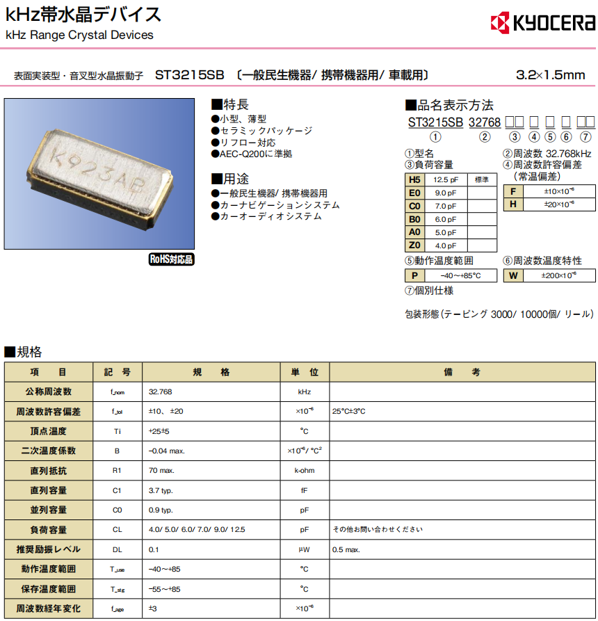 | ST3215SB32768H5HPWZZ | Kyocera晶振 | ST3215SB | 32.768kHz | -40°C ~ 85°C | 2-SMD, No Lead |