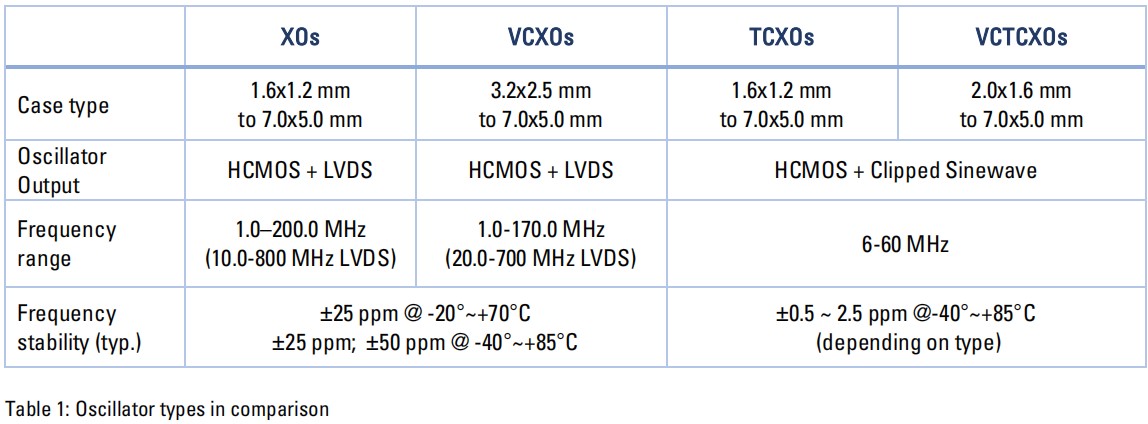 具有標準參數的最常見的振蕩器類型的概述見下表。這些值只是一個典型的例子。它們取決于制造商和類型。