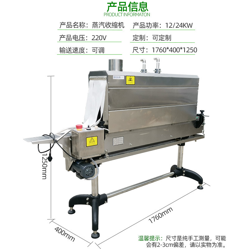 - 適用范圍廣:可以對各種形狀和尺寸的產(chǎn)品進行收縮包裝,只要產(chǎn)品的尺寸在收縮通道的設(shè)計范圍內(nèi)。無論是規(guī)則形狀的產(chǎn)品,如長方體的盒子、圓柱體的瓶子,還是不規(guī)則形狀的產(chǎn)品,都可以通過調(diào)整蒸汽的參數(shù)和輸送帶的速度等方式,實現(xiàn)良好的收縮包裝。
