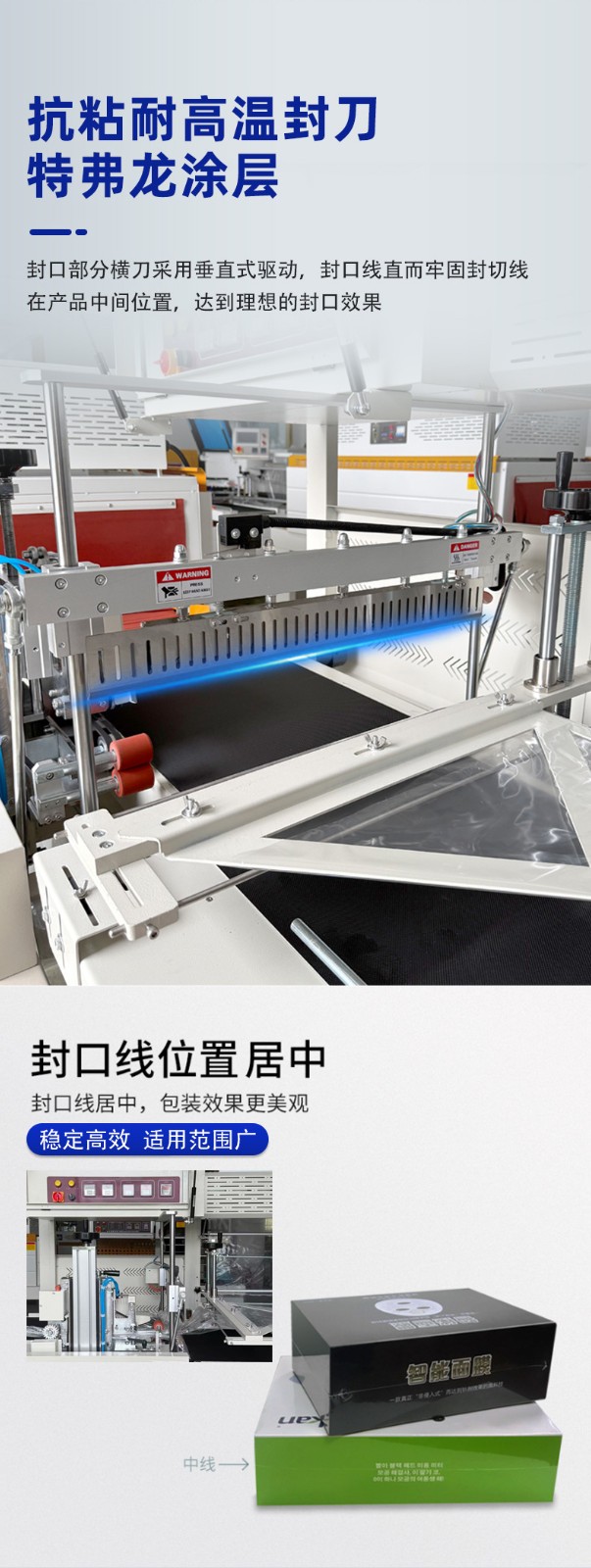 3. 自動化保護機制,保障運行穩定性設備內置多重智能保護功能:當薄膜用盡時,機器會自動停機并報警;封切刀溫度異常(過高 / 過低)時,系統會實時監測并觸發保護,防止薄膜燙破或封合不牢固;進料口無產品時,送膜與封切工序會同步暫停,避免空膜浪費。這些自動化保護不僅減少設備故障風險,也降低了人工巡檢的頻率,提升設備連續運行的可靠性。