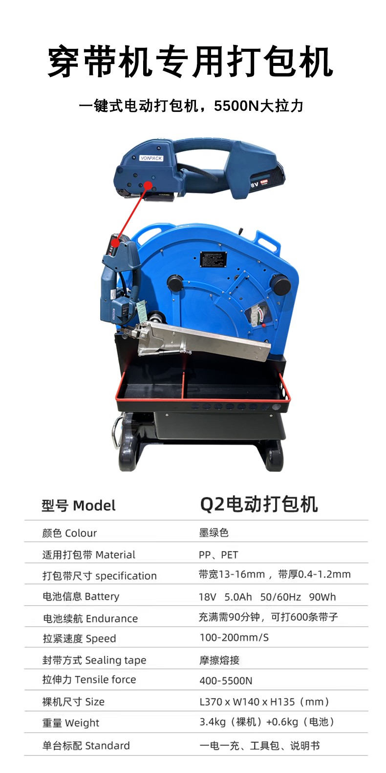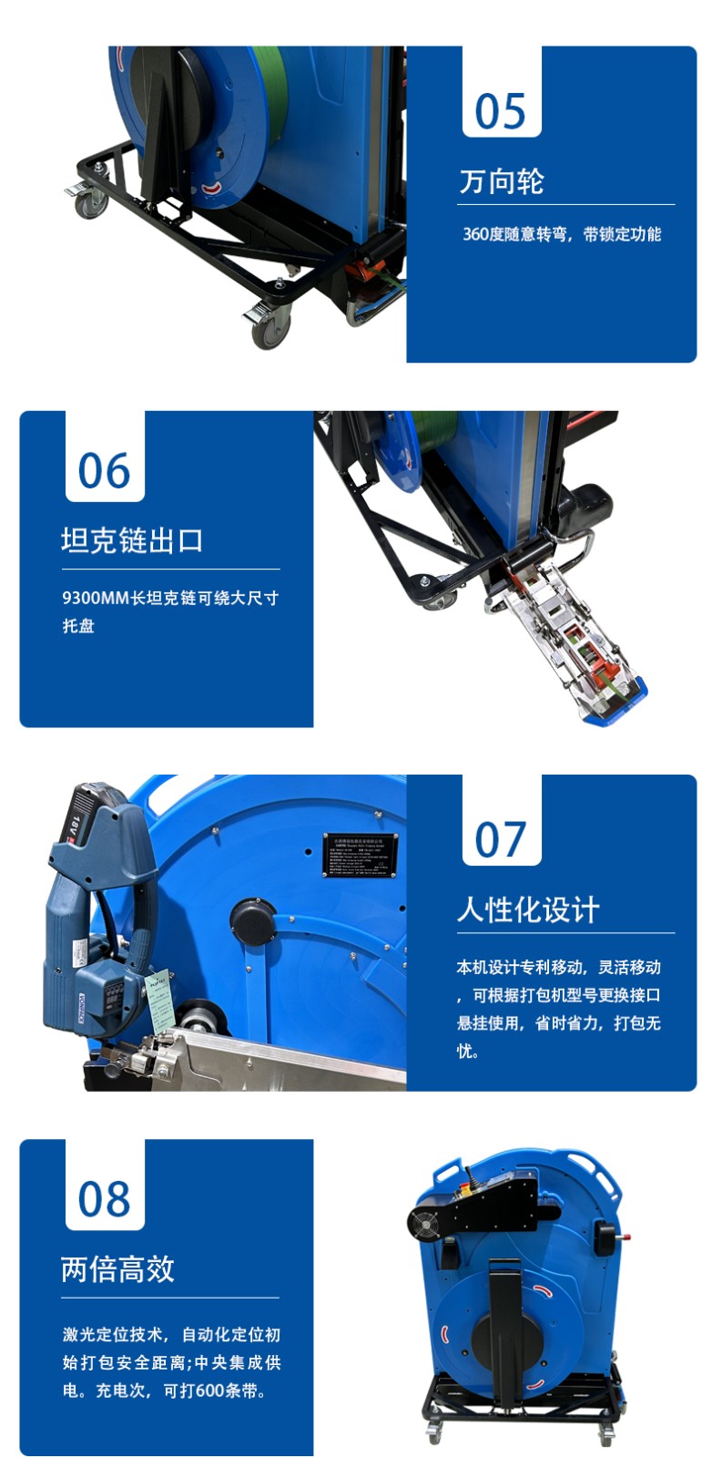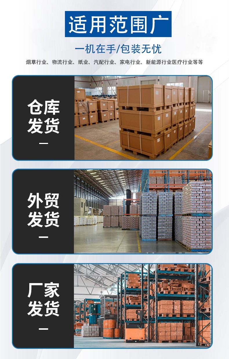 - 智能收緊:根據(jù)貨物類(lèi)型(如紙箱、金屬件)自動(dòng)調(diào)節(jié)束緊力(常規(guī)范圍 200-5000N),確保帶子緊貼貨物但不壓損,部分重型機(jī)型束緊力可達(dá) 9000N 以上,適配建材、鑄件等重物。