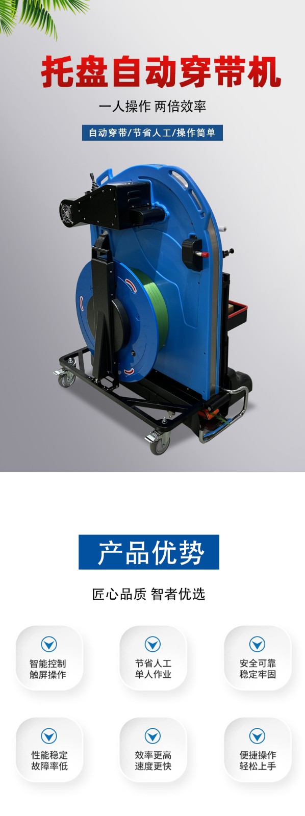 自動(dòng)托盤(pán)穿帶打包機(jī)是物流、制造等行業(yè)中實(shí)現(xiàn)托盤(pán)貨物自動(dòng)化捆扎的核心設(shè)備,通過(guò)機(jī)械結(jié)構(gòu)與智能控制的協(xié)同,將貨物與托盤(pán)牢固綁定,提升運(yùn)輸穩(wěn)定性與作業(yè)效率。以下從核心功能、技術(shù)優(yōu)勢(shì)、選型要點(diǎn)及維護(hù)建議四個(gè)維度,進(jìn)行全面梳理: