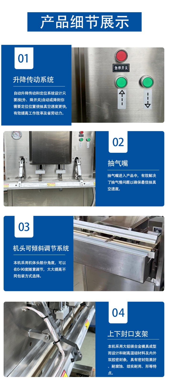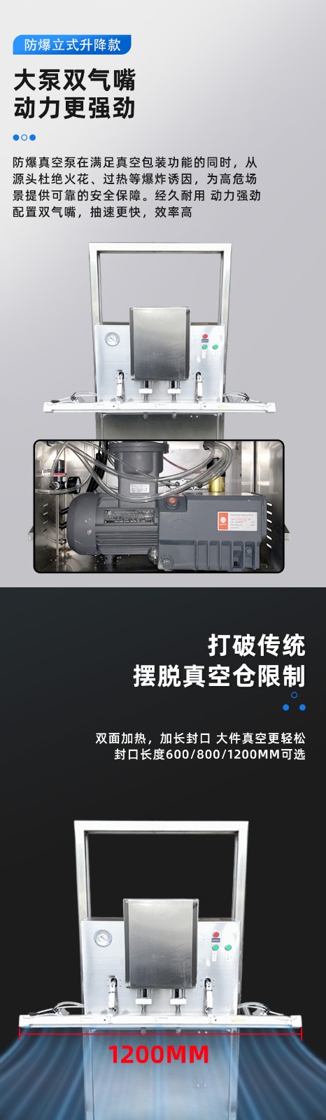 立式防爆真空包裝機的防爆配置集中在電氣、動力及密封過濾等關鍵部件,以此適配易燃易爆的特殊工況