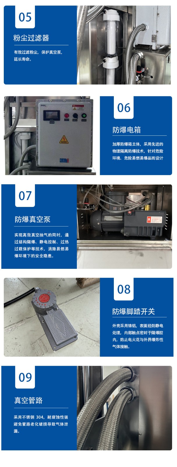 • 密封與過濾部件:機頭柜和電柜均采用全密封設計并加裝密封膠條,防止易燃易爆氣體、粉塵進入內部損壞元件或引發短路;關鍵的抽氣口、真空室等采用 304 不銹鋼材質,部分機型還配有 40mm 厚的有機玻璃透明觀察窗,既保障防爆性能又便于觀察包裝過程;同時加裝粉末隔離和過濾裝置,防止包裝物料中的粉塵堵塞真空泵,避免設備故障導致的安全問題。