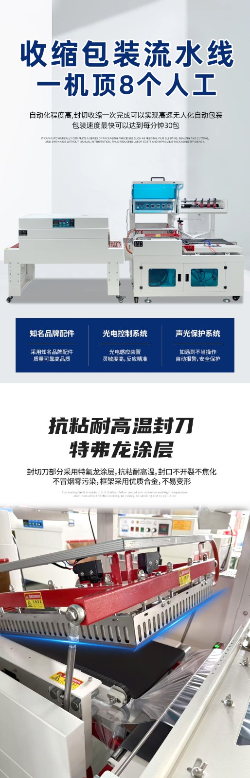 能夠自動完成產品的進料、套膜、封切、熱收縮及出料等全過程,實現連續不斷的流水線作業,無需人工干預。