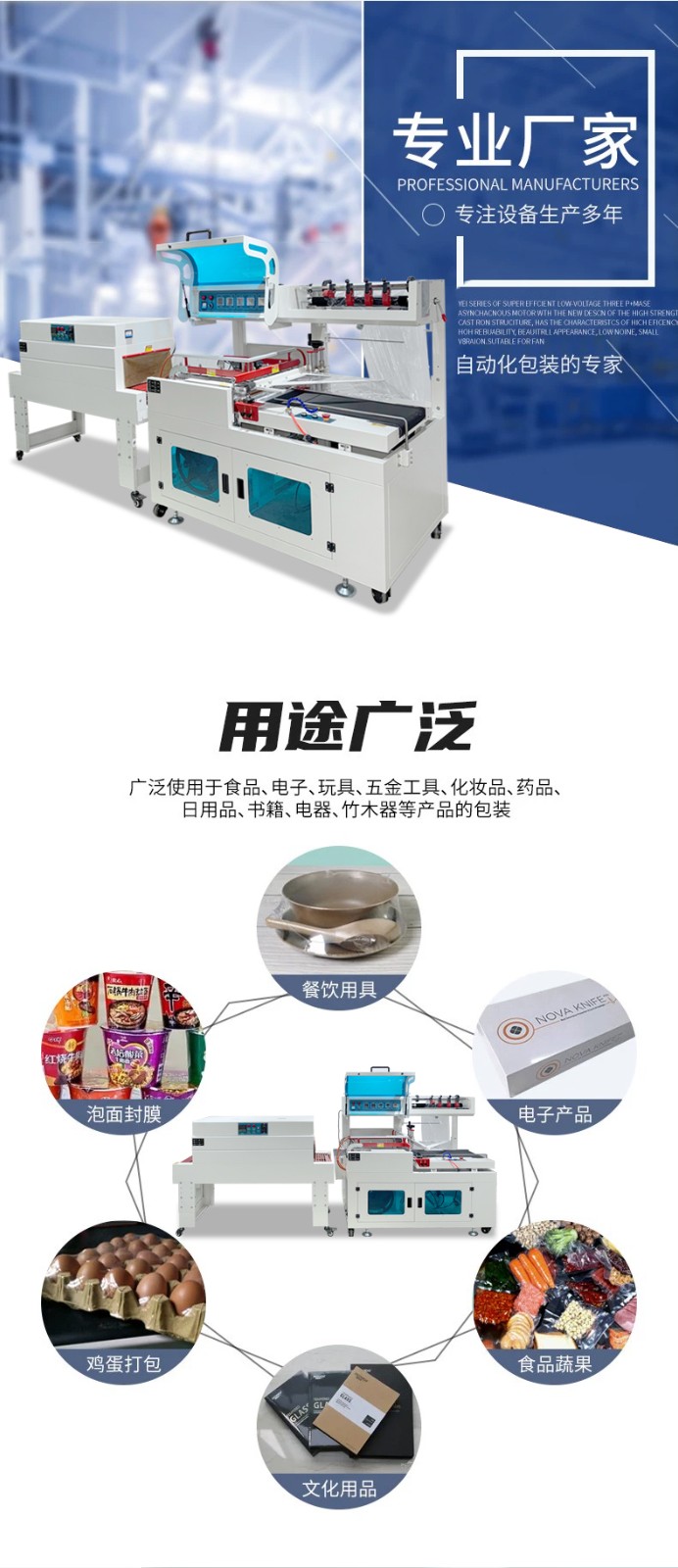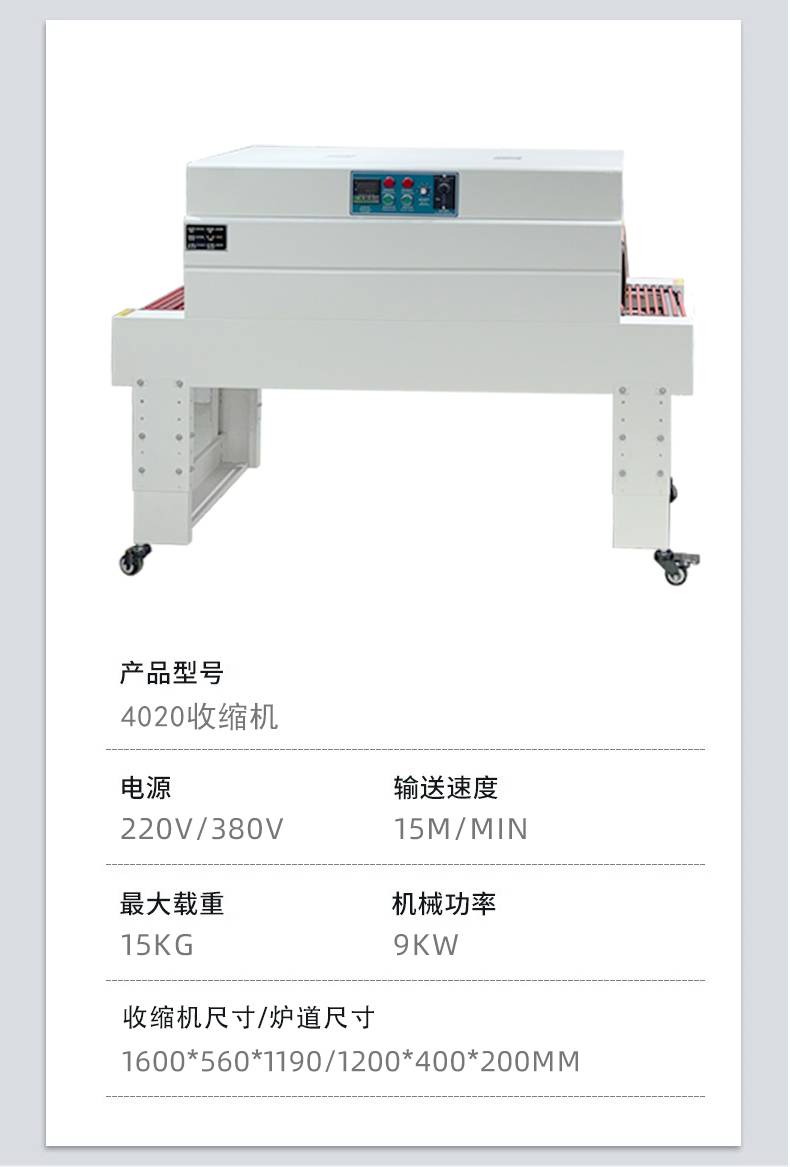 廣泛應用于食品、化妝品、醫藥、印刷品、飲料、五金塑料等行業,適用 POF、PE、PVC 等各種收縮包裝材料。